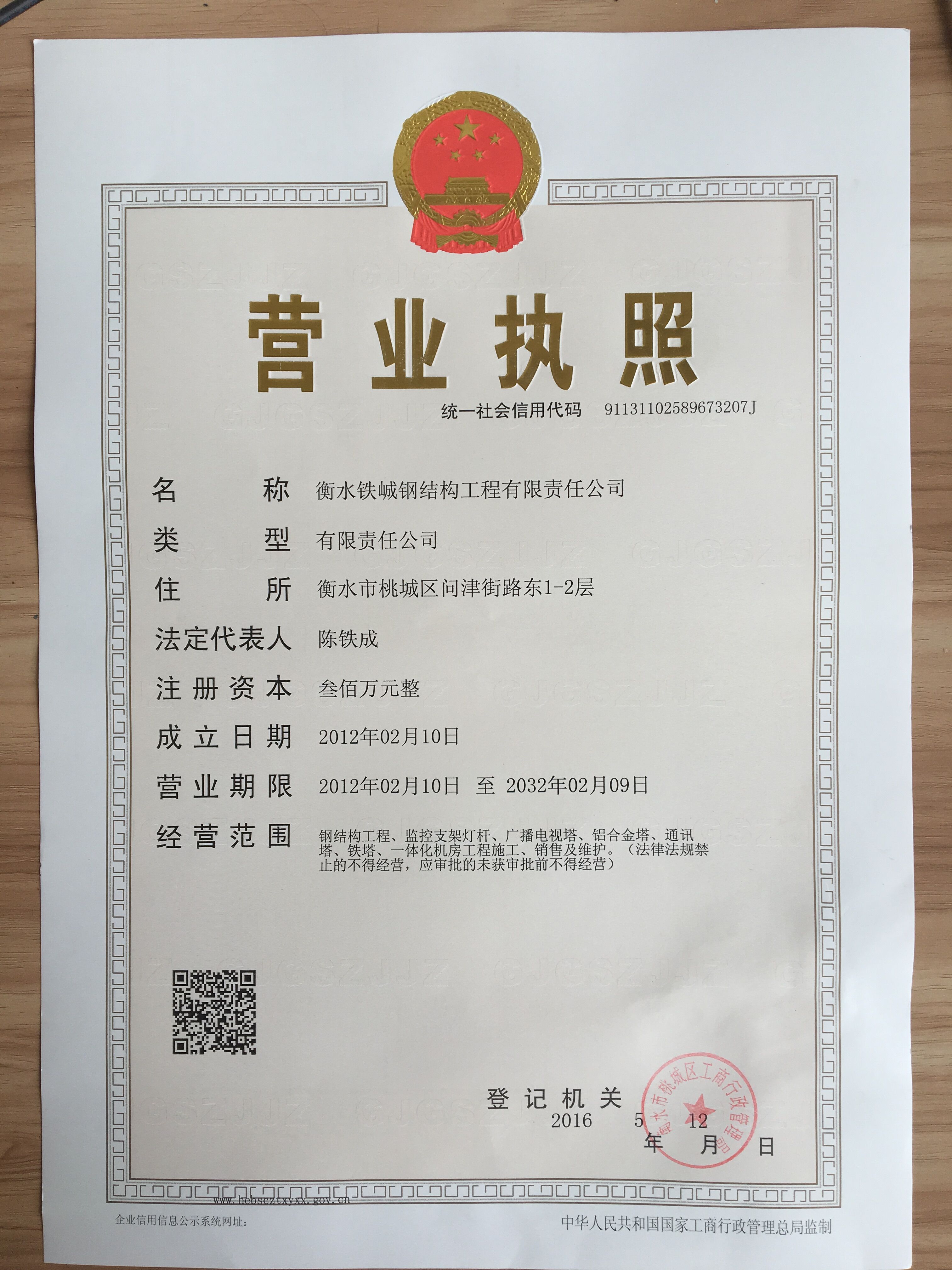 衡水鐵峸鋼結構工程有限責任公司,是生產各種鐵塔的專業廠家,始建于1972年。隨著我國改革開放和通信事業蓬勃發展,本公司為設計、制造、安裝各種造型的瞭望塔、煙囪塔、廣播電視塔、微波通信塔、移動通信塔、桅桿拉線塔、電力架線塔、大型無縫鋼管塔,電力桿塔、樓頂鋁合金塔、樓頂不銹鋼裝飾塔,我公司還生產斜放交叉梁系列網架、鋼結構工程。微波線路的設計及天饋線安裝,我公司現已發展為擁有職工685人,工程技術管理人員78人,年產量達到18000噸以上。